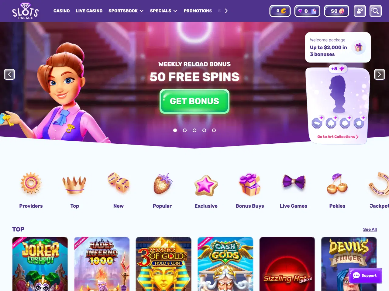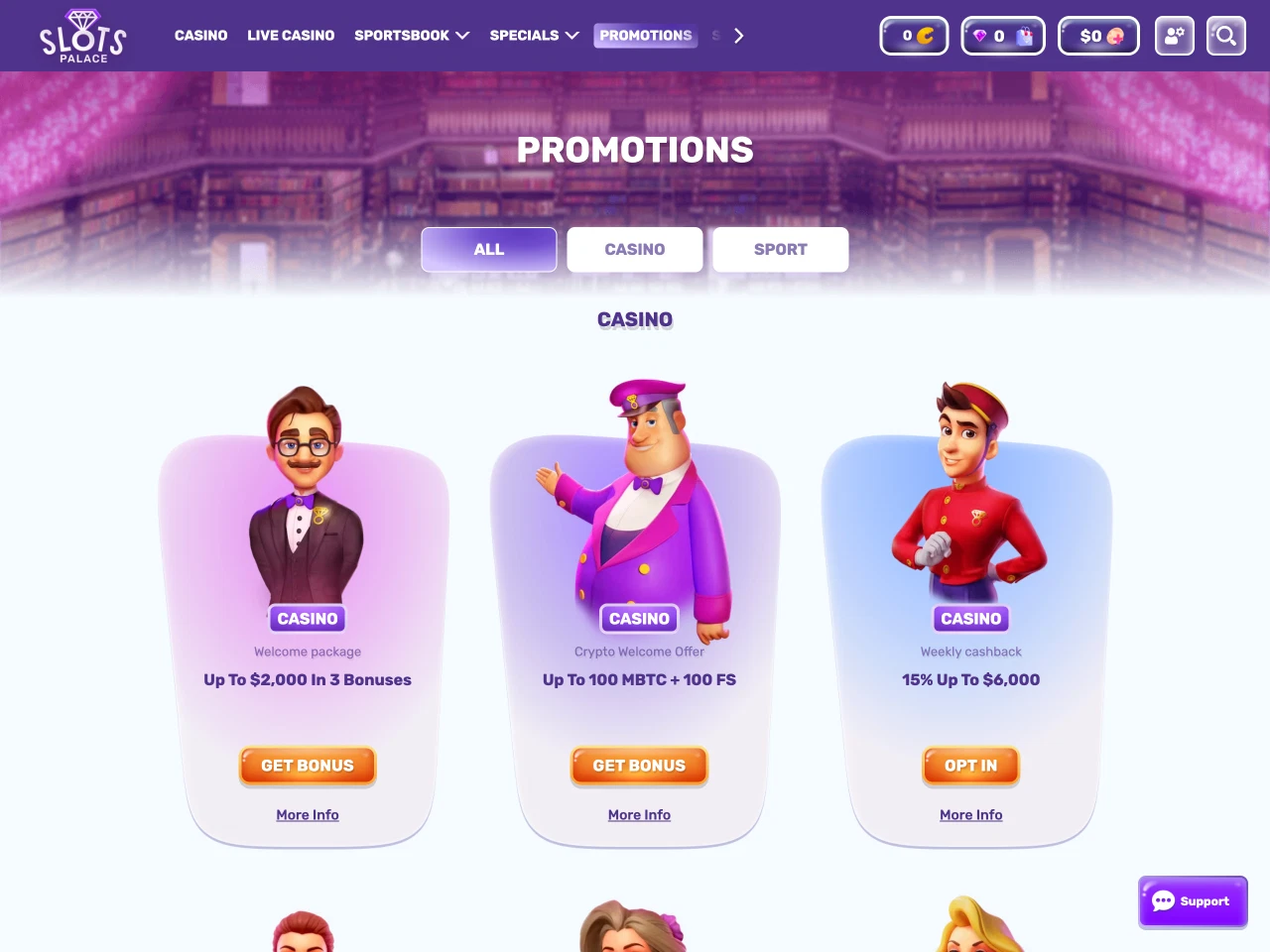 SlotsPalace provides a structured bonus package of up to $2,000 across the first three deposits. Beyond that, there’s a separate crypto welcome offer of up to 100 mBTC and 100 FS, reloads with cash and free spins for deposits made on different days throughout the week, a live 55% cashback (up to $400), and a Bonus Crab game offering random prizes. For roulette fans, there’s also a promo. All you need to do is bet on the chosen roulette titles and win. For every winning bet, a player receives points that are added to the leaderboard with all participants. If you climb high enough, you will get a prize of up to $16,000. In addition to all promo offers, players can also collect comp points, Diamonds, at the casino and exchange them for free spins or cash bonuses at the Bonus Boutique. One of the ways to earn Diamonds is to complete achievements and therefore unlock Art Collections. Each completed collection brings players up to 70 Diamonds.