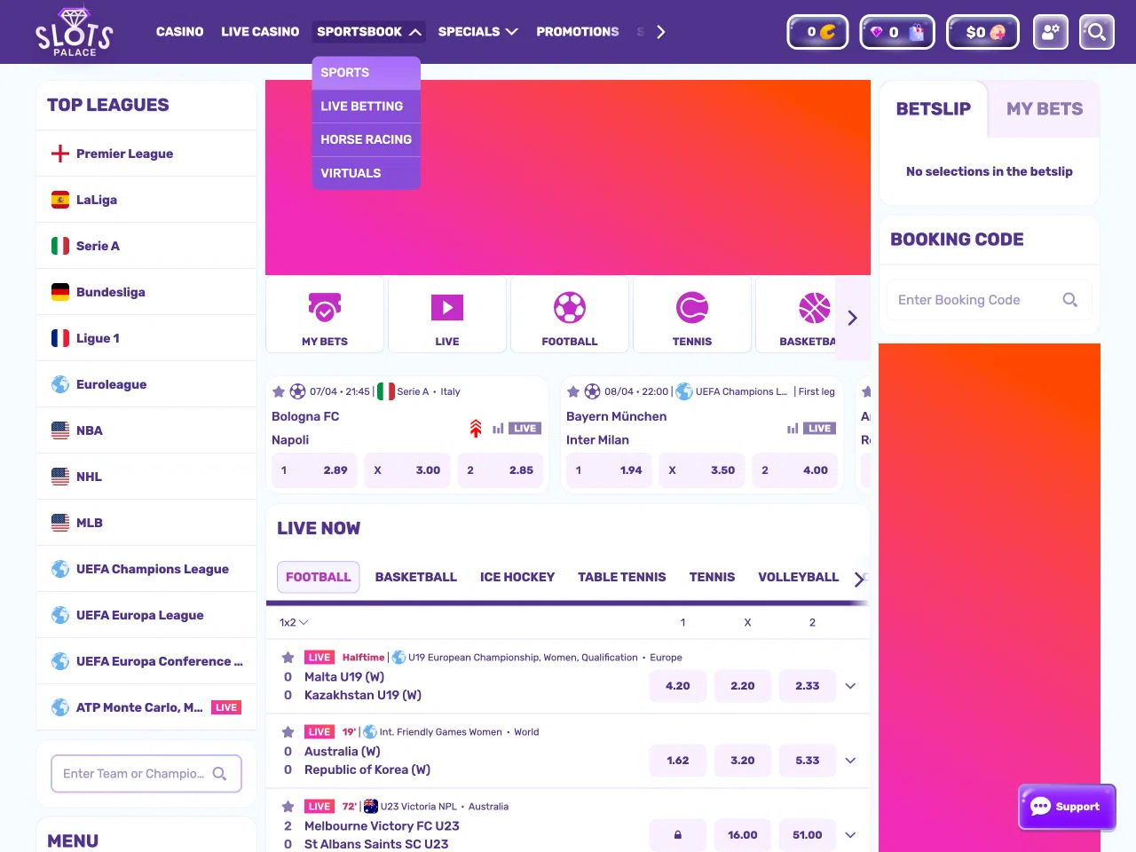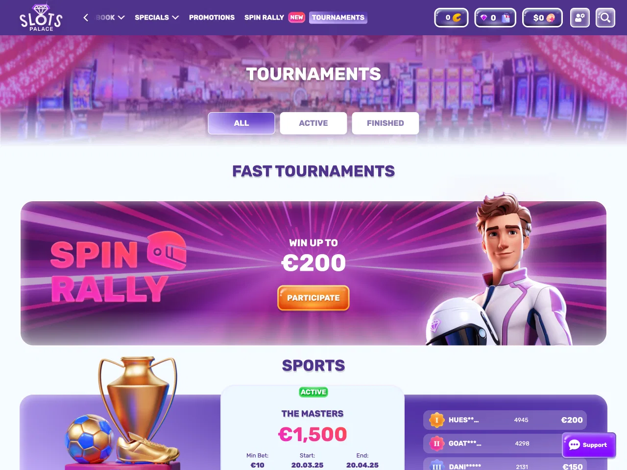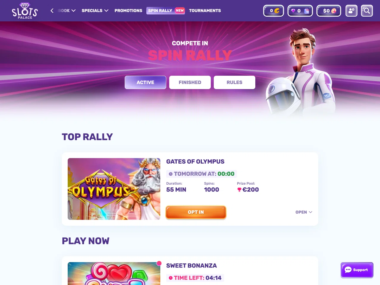 SlotsPalace Casino offers a lavish design and unique offers to bring the gambling experience of players to the next level. At SlotsPalace, you can get various bonuses, e.g. cashback, reload bonuses, a promo for crypto users, offers for roulette fans with a prize of $16,000, etc. Here, you can find a comprehensive game selection with over 250 live games and exclusive titles like Break the Piggy Bank. The casino also offers players to earn Diamonds and get even more bonuses for them at the Bonus Boutique. Furthermore, to turn regular spins into real rewards, the casino also offers Spin Rally, where players need to make a certain number of spins in a limited time to get a cash prize.