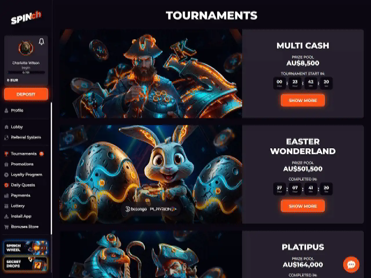 Spinch Casino offers its users a comprehensive loyalty program with 25 levels, each offering richer rewards than the previous one. To level up, players should accumulate complimentary points (CPs) with each deposit, earning one CP for every $30 bet on pokies games. Advancement through these levels unlocks benefits such as increased weekly and monthly withdrawal limits. Yet, note that the loyalty level resets every three months.