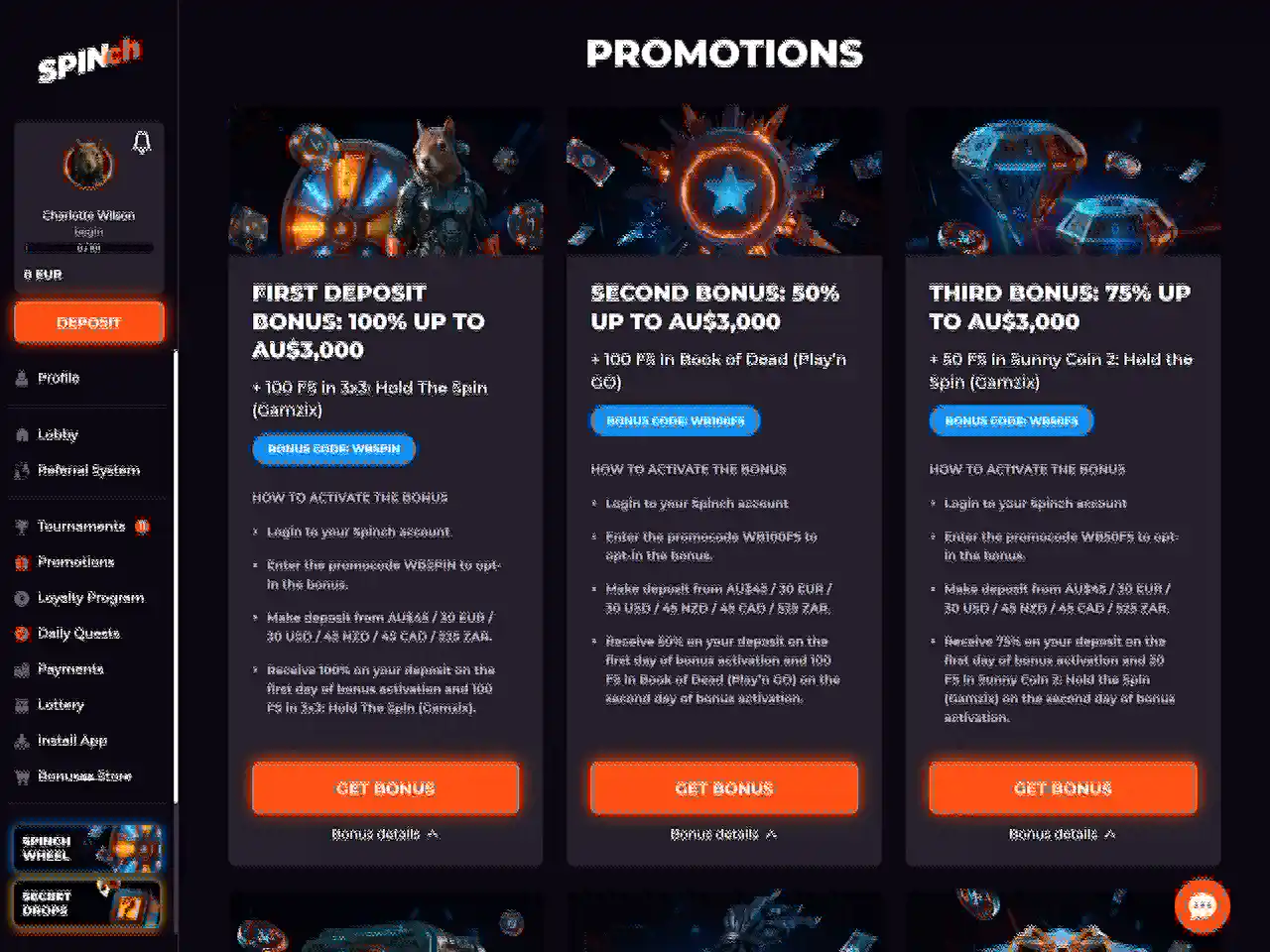 Spinch Casino has plenty of bonuses to offer its customers. First of all, new players have an opportunity to claim a welcome pack for their first three deposits. For users who prefer making larger transactions, Spinch also has a welcome high-roller offer. In addition to that, this casino has reload bonuses with free spins and real money, daily cashback of up to 20%, and special crypto offers. Moreover, you can get an additional reward of $30 for inviting a friend to Spinch Casino. If you want more rewards, you can try to take part in the Spinch lottery and complete daily challenges. More detailed information about each promotion can be found on the official website of the Spinch Casino.