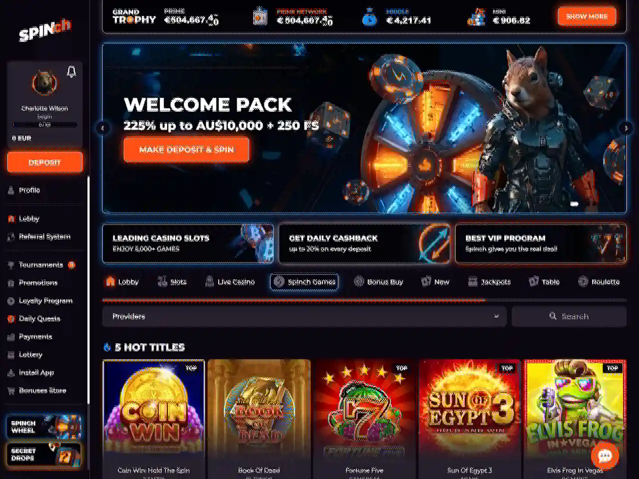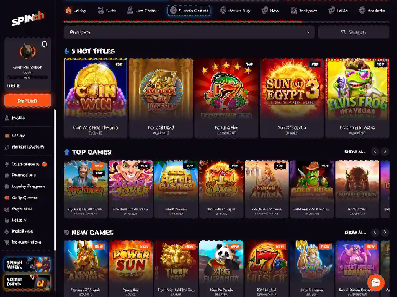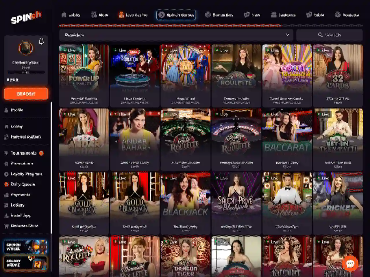 Spinch Casino offers over 5,000 different games, including pokies, table games, live dealer games, and jackpots from 60+ well-known providers.