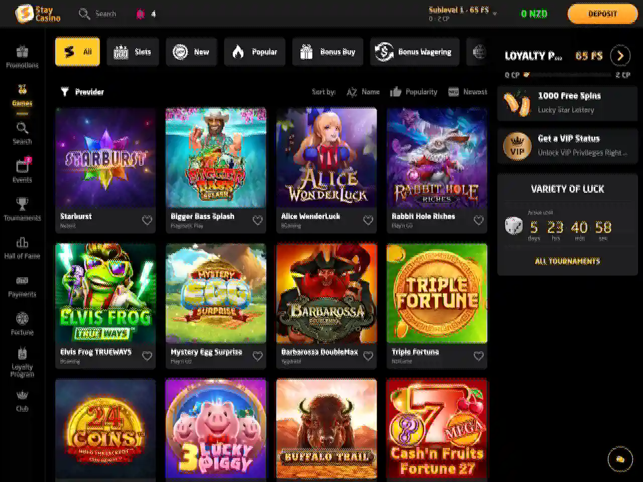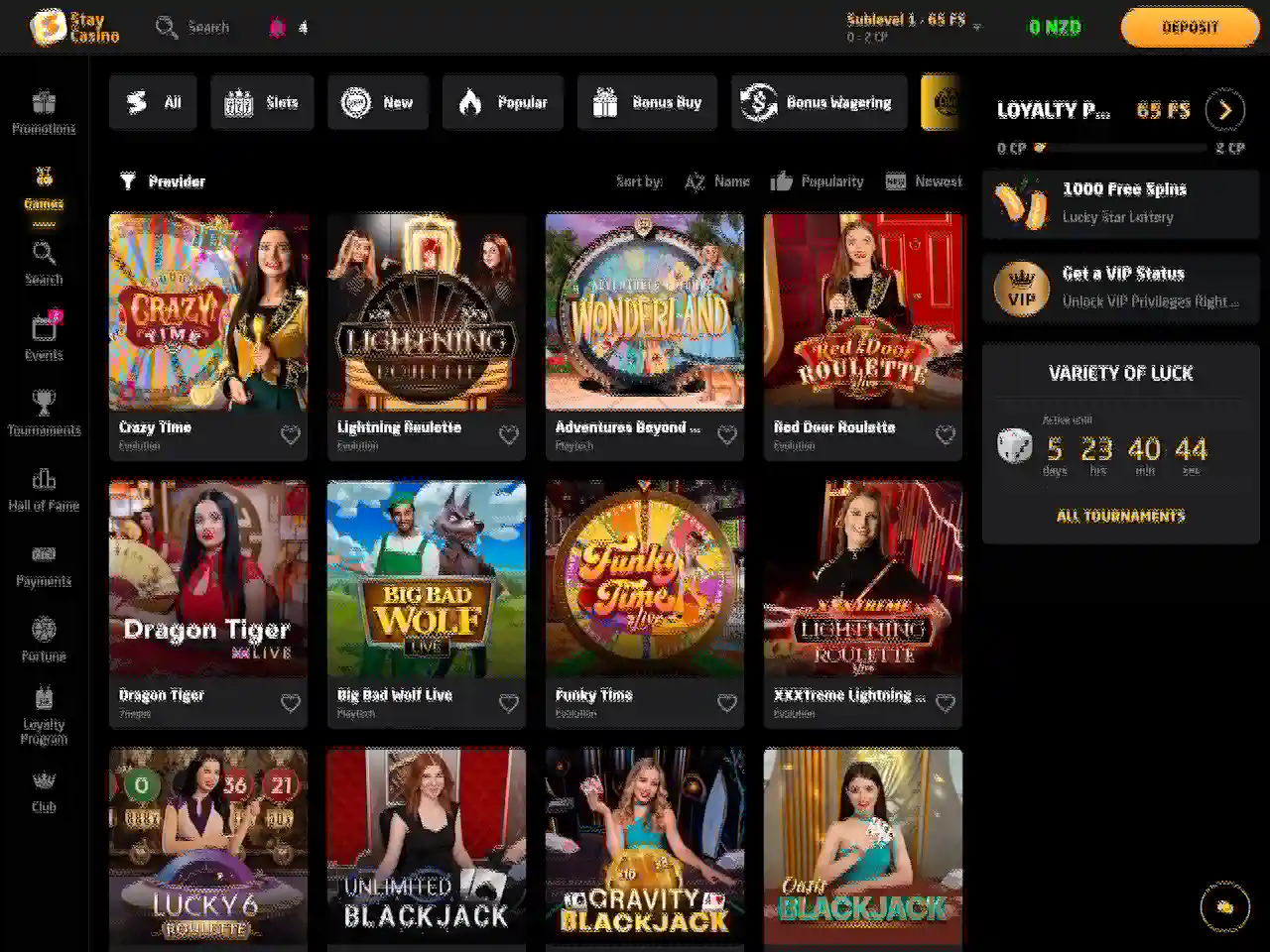 Stay Casino hosts an expansive catalogue of various games of 8,000 games, including over 400 live dealer titles, a figure not commonly seen across Kiwi-facing platforms. The selection of tables is nice, offering poker, roulette, baccarat, and other types of games that you may want to find at the casino. As for pokies, at the casino you can find a comprehensive selection of fruit pokies, jackpots, titles with built-in features, etc. Most games show up with high production value and consistent uptime. Mini-games are also available, making the gameplay more fun.