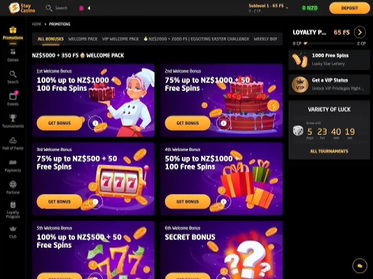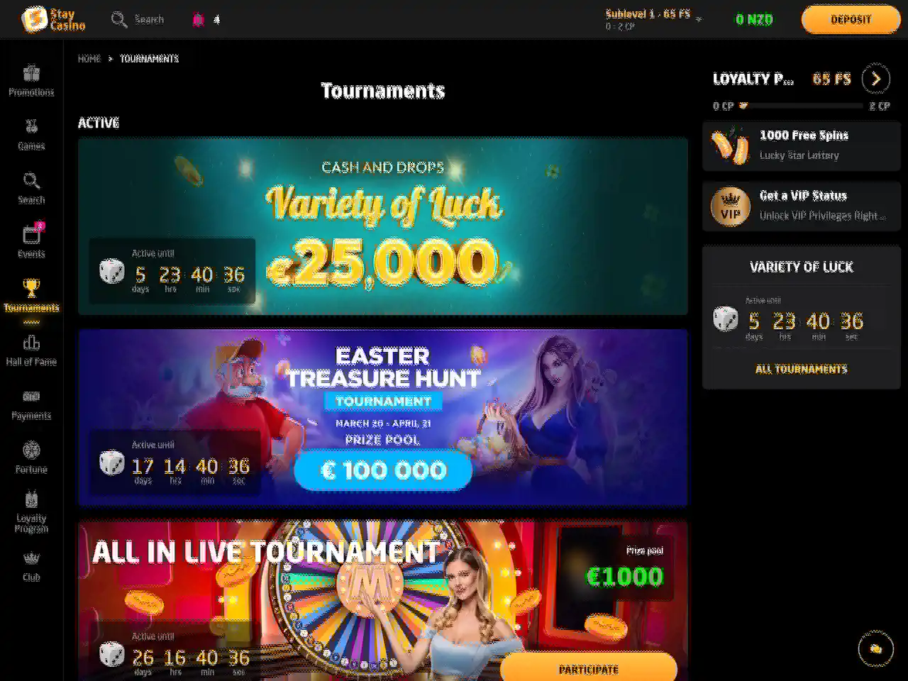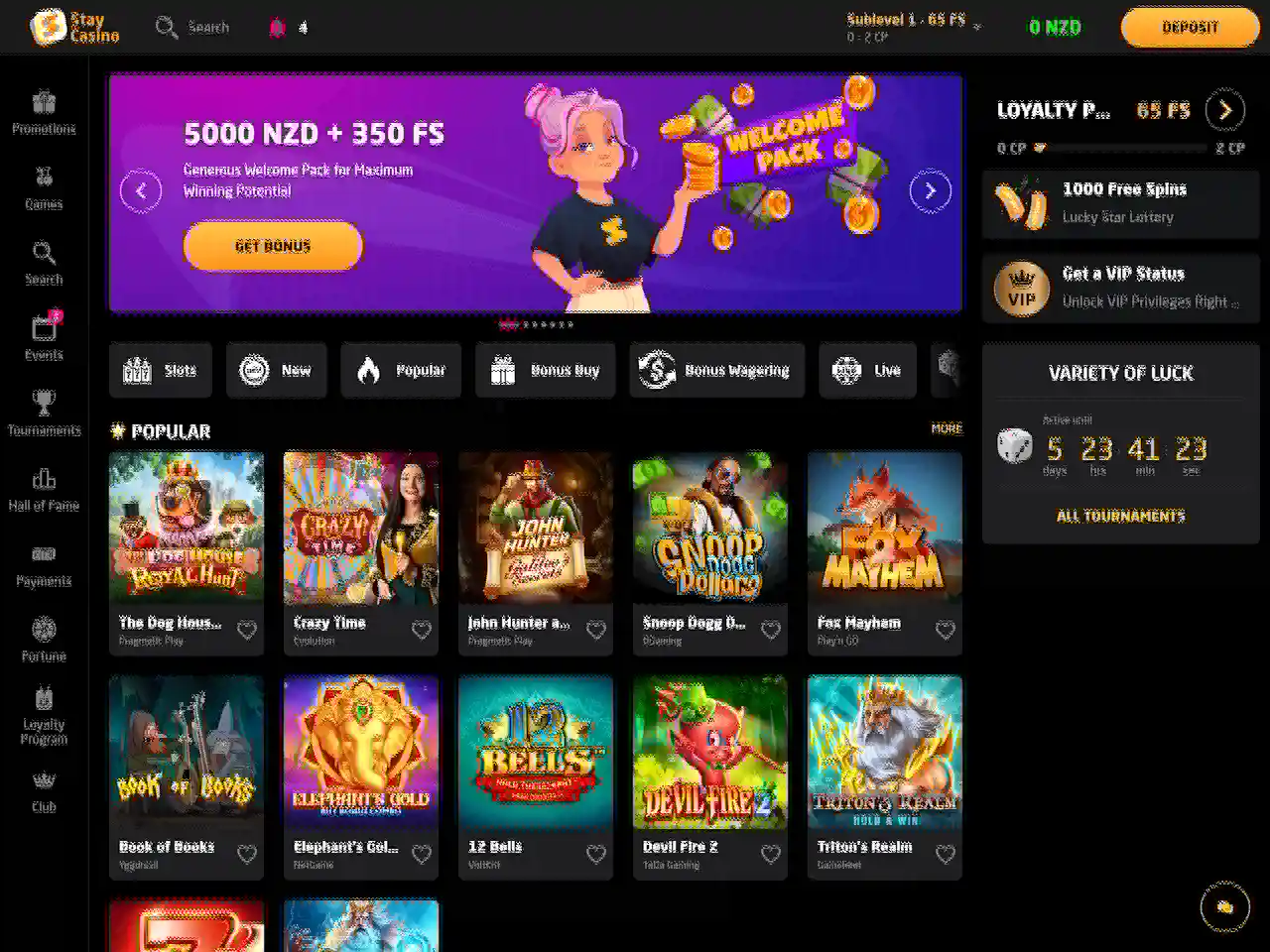 Stay Casino boasts over 8,000 games, offering exceptional variety in real-time gameplay of over 400 titles. The casino also provides gamblers with Fortune Wheel, spinning which can bring players free spins and cash prizes. Other promotions at Stay are remarkable as well: players can receive no-deposit free spins that are ideal for risk-free trials, and gamblers can also receive no-wagering cashback. For players convenience, Stay Casino has an Event calendar, where gamblers can see upcoming bonuses, events, and other activities which can grant them more prizes.