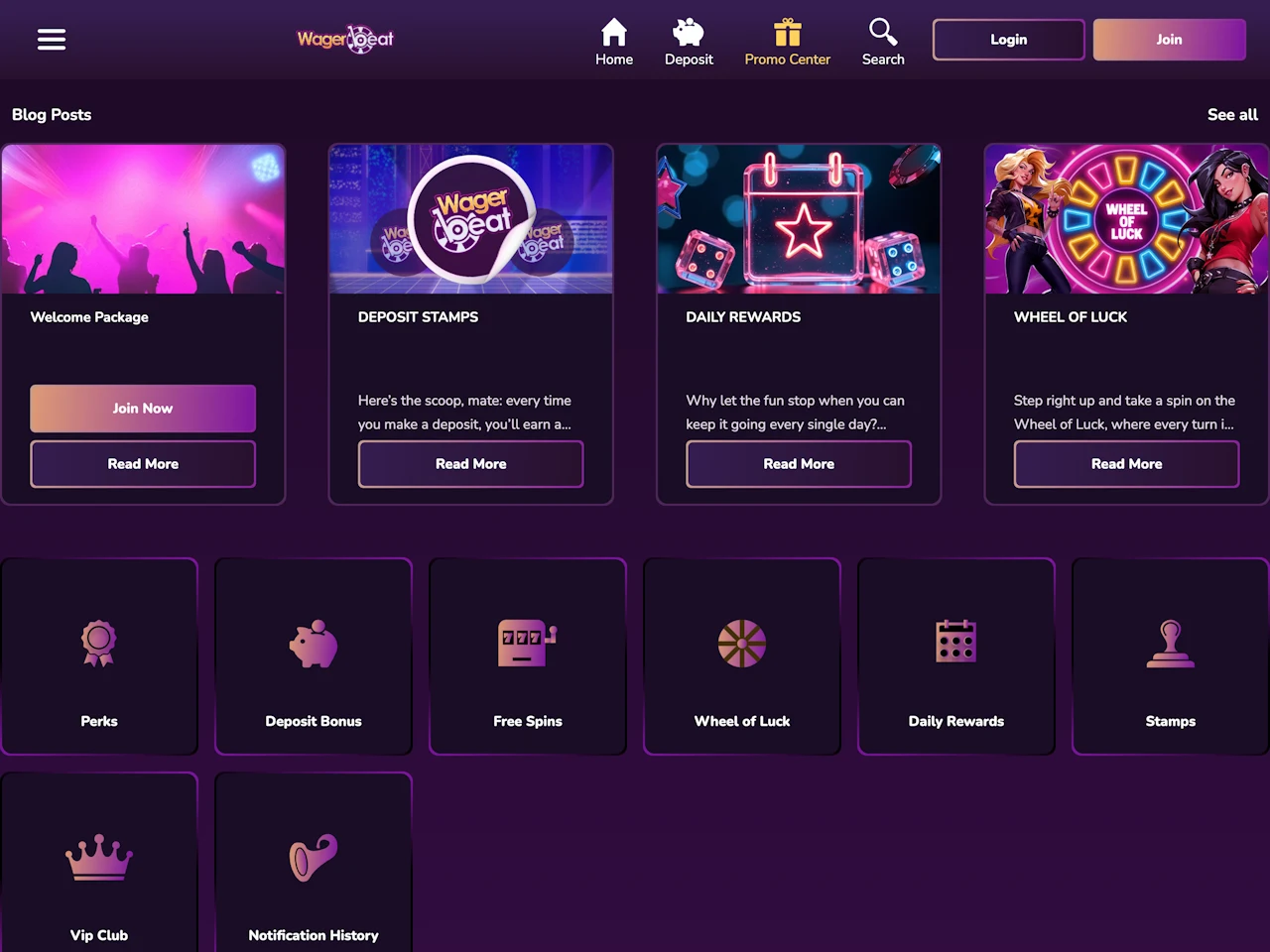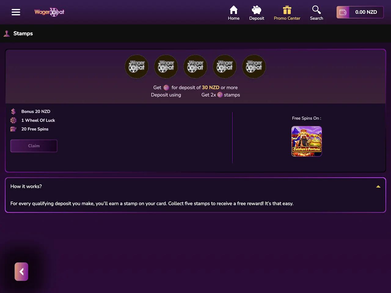 Wager Beat provides players with a full diversity of games, despite the fact that there are only 1,500 titles. On the website, you can also collect casino points called stamps, which can be exchanged for various bonuses and used to get into the VIP program. Spinning the Wheel of Luck at Wager Beat can bring players free spins, a no-wagering cash prize, or a deposit bonus. Users can spin the wheel 2 hours after each deposit they make. The casino offers players daily rewards, which may include free spins, spins on Wheel of Luck, and cash bonuses. Wager Beat also rewards all active players with a program named Perks, which features 100 levels and grants additional bonuses for reaching new levels.