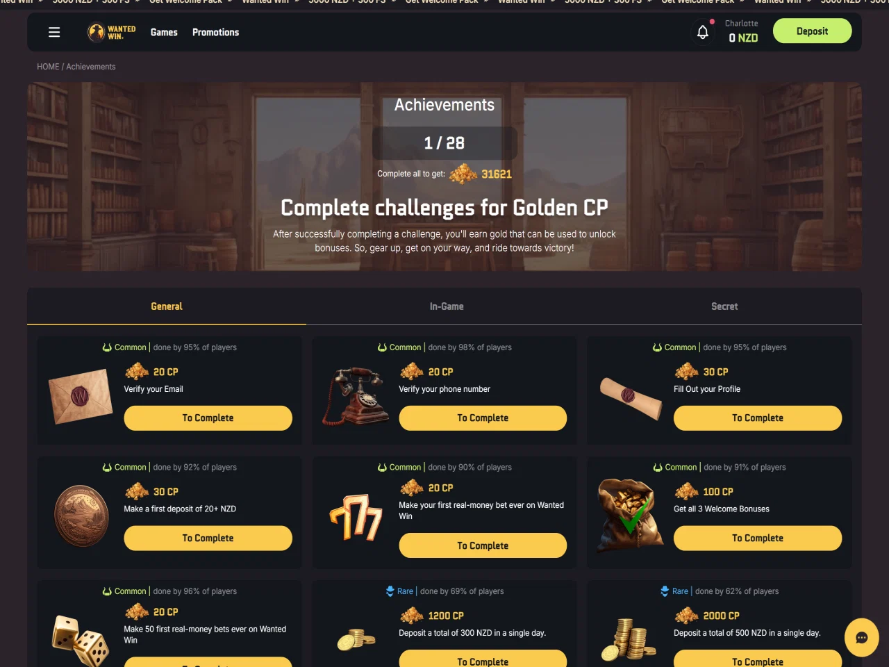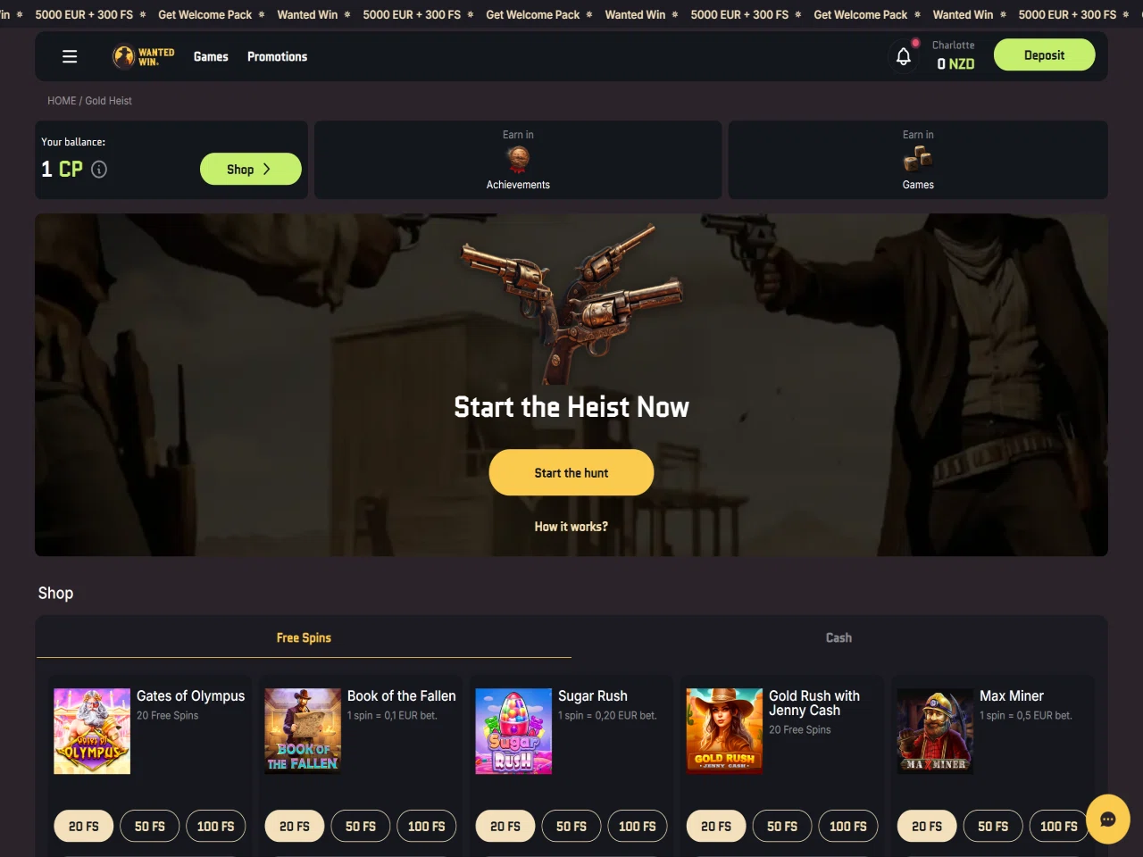 At Wanted Win, players can dive into Wild West time and participate in the Gold Heist. The Gold Heist is a mini-game where players can earn comp points, as well as steal them from other, less active gamblers. In addition to the thrill of Wild West, the casino boasts more than 6,000 games, with 100+ of them being live dealer titles. Also, Wanted Win has a Provably Fair feature that allows the gaming process to be more transparent. Regarding bonuses, users can claim a welcome pack, weekly reloads with free spins, bonus money, and cashback, as well as try their luck with the Lootbox, a feature that provides surprise prizes. Users who verified their e-mail will receive letters with more unique promotions. Moreover, there is a separate section called Achievements, where players can earn CP by completing different assignments. The first one can be completed just by creating an account and verifying the e-mail address. Earned points can be spent in the Bonus Shop on free spins and bonus money.