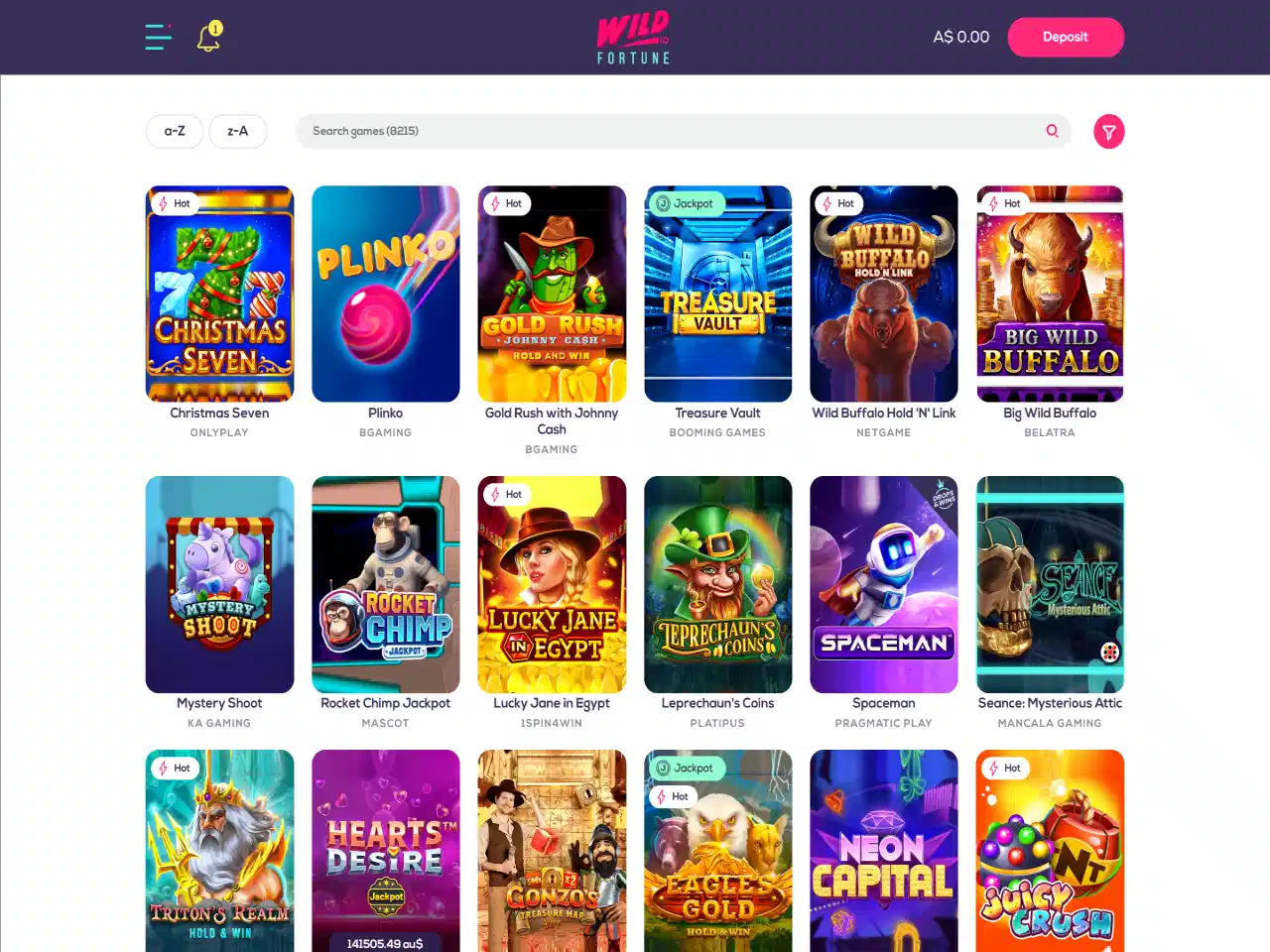 Wild Fortune Casino features more than 11,000 titles spanning nearly every known category of online gambling. There are 300+ live games, an unusually high count compared to similar operators. Blackjack, baccarat, roulette, and live shows are all represented in the live dealer catalogue. Grizzly Pine's Jackpot Mines adds a strategic layer to standard pokies with its three tiers: Bronze, Silver, and Gold, each of which can bring different maximum wins . The minimum bet to participate is $1,5. Lottery games are available as part of weekly draws, with prize pools advertised at 5,000 Free Spins. The lobby also includes table games and Bonus Buys.