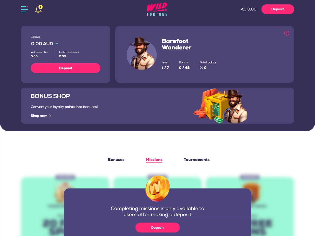 The loyalty program at Wild Fortune includes seven tiers, beginning with Barefoot Wanderer and ending at Gold Reaper. Progression is based on total deposits, not wagering volume. You need to accumulate loyalty points in order to level up. For every $30 you wager, you will receive one loyalty point. Each level unlocks fixed rewards, such as cashback, bonus credits, and free spins that increase as you advance. Loyalty points can also be redeemed in the Bonus Shop, found in the profile menu.
